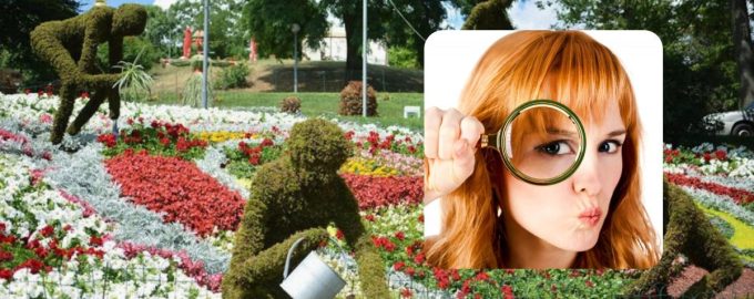 På bilden nedan kan du se färgglada blomsterrabatter i parken. Förutom de vanliga blommorna som skapar ett originellt mönster, visar fotot gröna skulpturer av ”trädgårdsmästare”. Försök att hitta en liten sparv bland dem.