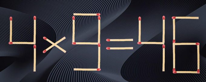 Nedan ser du en bild där ett exempel har lagts ut med tändstickor. Det står att 4 gånger 9 ger svaret 46. Din uppgift är att flytta endast två tändstickor i detta exempel så att det blir rätt.