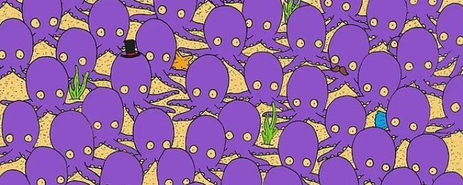 En av dessa teckningar visar många bläckfiskar. Först verkar det som om det inte finns några andra än bläckfiskar, men så är det inte – någonstans lurar en fisk, skriver jagranjosh.