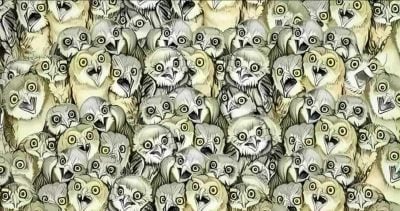 Ta en titt på bilden nedan. Bilden visar en grupp ugglor. Men de är inte ensamma. En katt har skickligt gömt sig bland ugglorna.