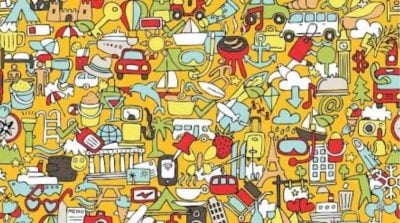 Det finns många olika föremål på bilden: från mobiltelefoner till bilar, skor och kläder. Någonstans bland dem finns ett klistermärke med Eiffeltornet, som vi måste hitta.